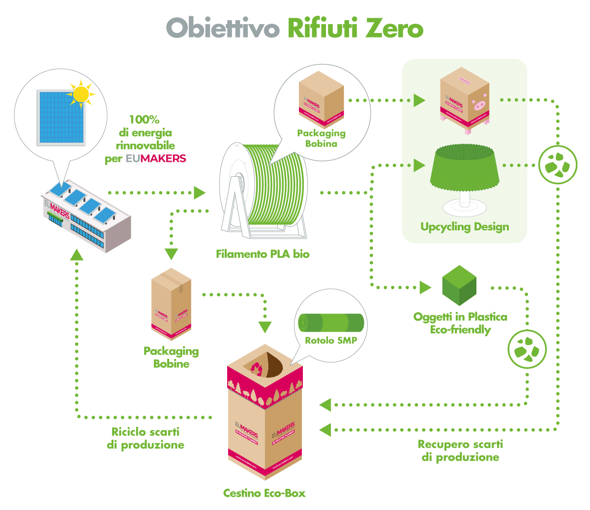 L’innovazione tecnologica nel pieno rispetto dell’ambiente e la diversificazione dei settori produttivi ha portato, nel tempo, alla creazione di 3 società (RIGENERA Biocompound, EUMAKERS and eumakeit), che hanno permesso all’intero gruppo di definire un circuito virtuoso di sostenibilità che indissolubilmente li collega e caratterizza ogni singolo aspetto del gruppo.